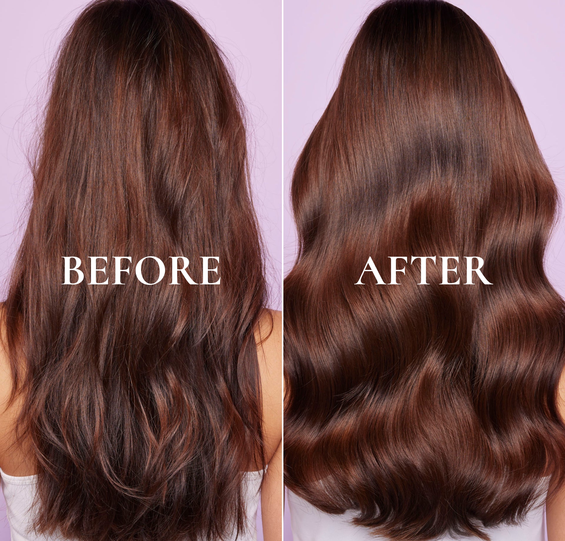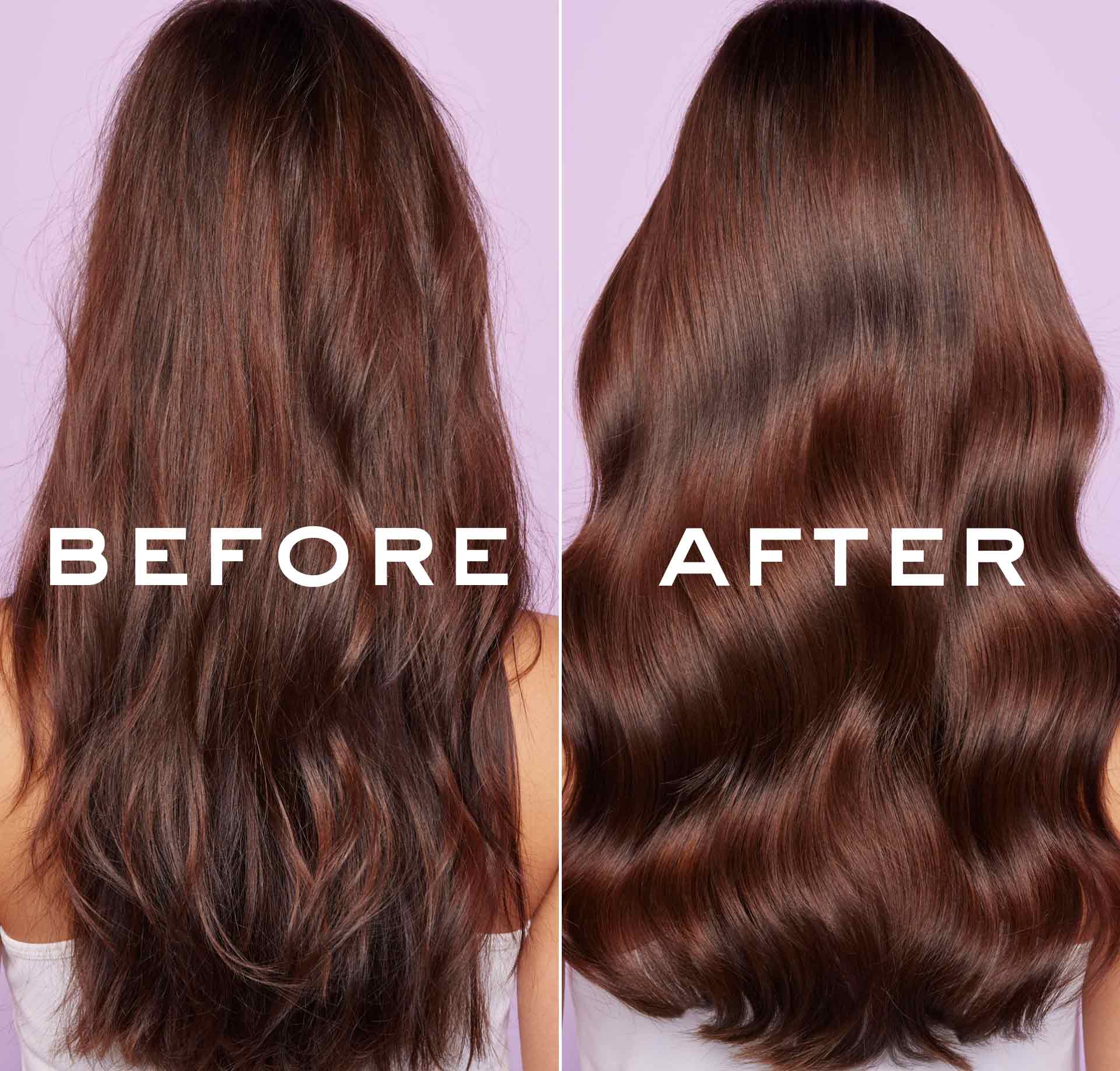 Prima / Dopo: Risultati dopo l’applicazione di Shampoo effetto lucentezza, Maschera capelli riparazione intensa, Latte capelli districante senza risciacquo.