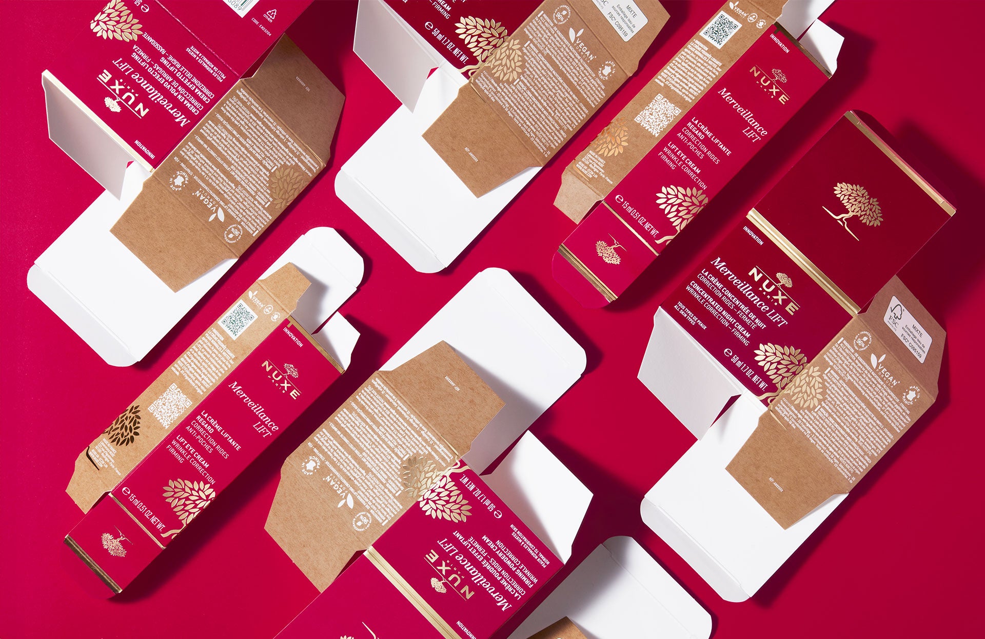 Nel 2022, NUXE ha ridotto del 35% la quantità di plastica dei packaging della gamma Merveillance Lift(1). I cofanetti di Natale sono realizzati con lo 0% di plastica e il 100% di cartone interamente riciclabile. Entro il 2025, NUXE mira a ridurre di un ulteriore 20% l’utilizzo della plastica per i suoi packaging.