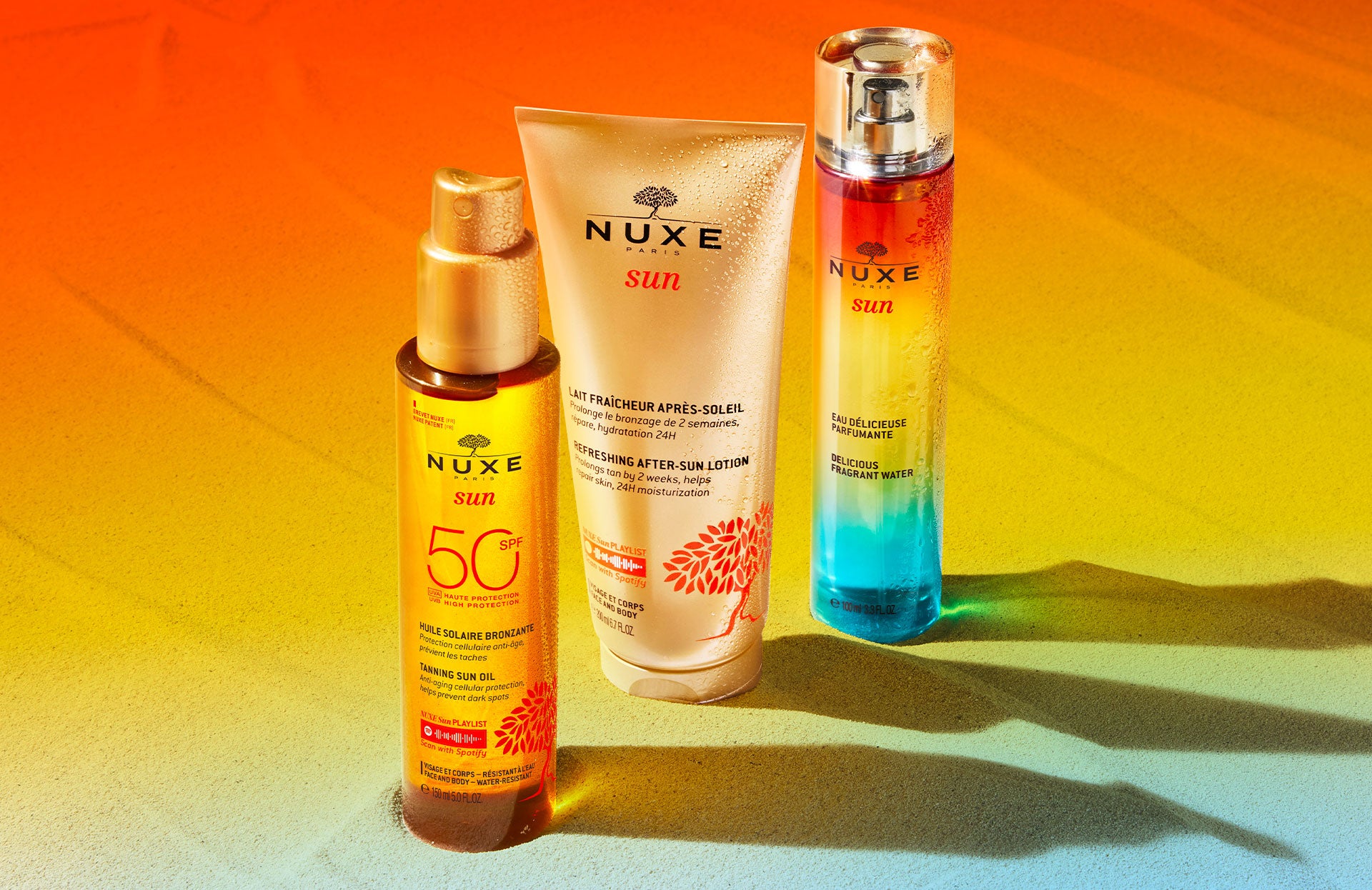 Il Laboratoire NUXE si lancia nel settore dei solari e dimostra che i prodotti di protezione possono anche essere glamour. NUXE Sun si distingue per le sue texture inebrianti e il suo profumo d’evasione dalle note ammalianti. Gli oli solari riscuotono successo, come pure il latte doposole: sono il N°1 delle loro categorie⁽⁸⁾ in farmacia in Francia. L’Acqua deliziosa NUXE Sun è anche il profumo più venduto in farmacia⁽⁹⁾ in Francia.