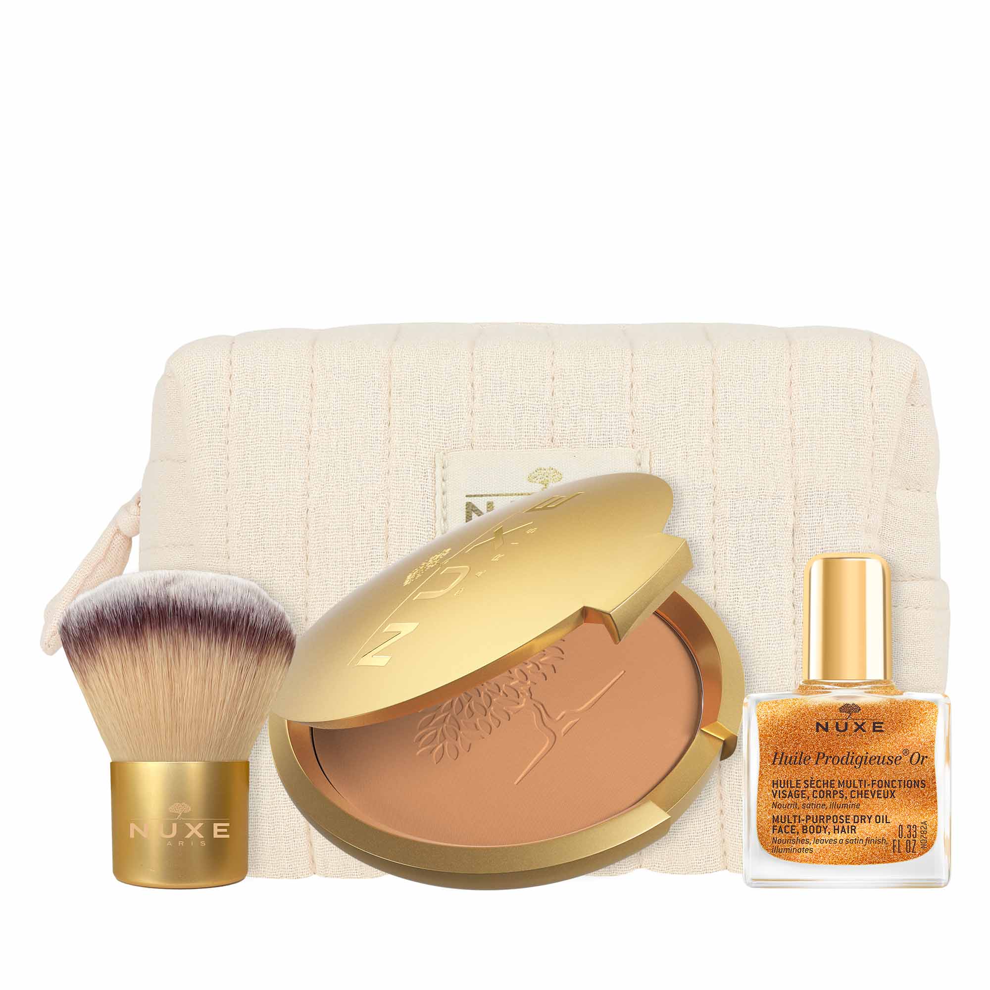 Un duo illuminante per un incarnato radioso e una pelle sublimata, completo di pennello kabuki e raffinata pochette.
