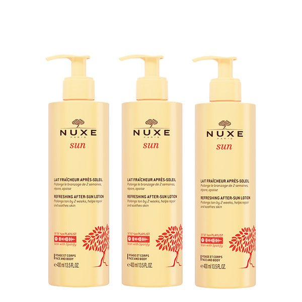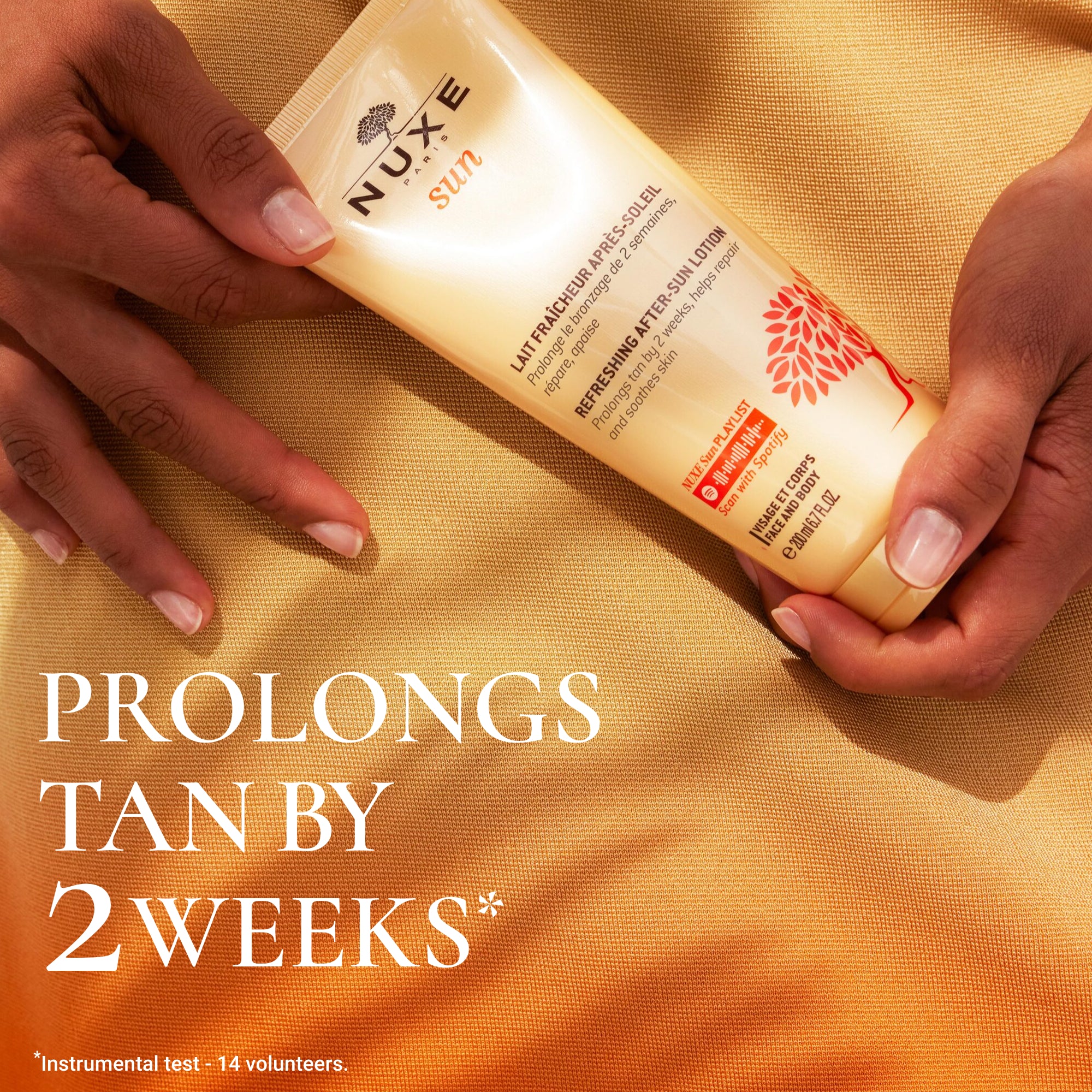 Questo Latte doposole viso e corpo è il segreto per le pelli accaldate dopo una giornata di esposizione al sole. Sotto l’effetto della sua incredibile freschezza, la pelle è lenita, riparata e idratata in modo duraturo. La sua formula esalta l'abbronzatura e la prolunga di 2 settimane⁽¹⁾. La pelle è immediatamente confortevole per il 90% delle utilizzatrici⁽²⁾; è lenita per il 98%⁽²⁾.